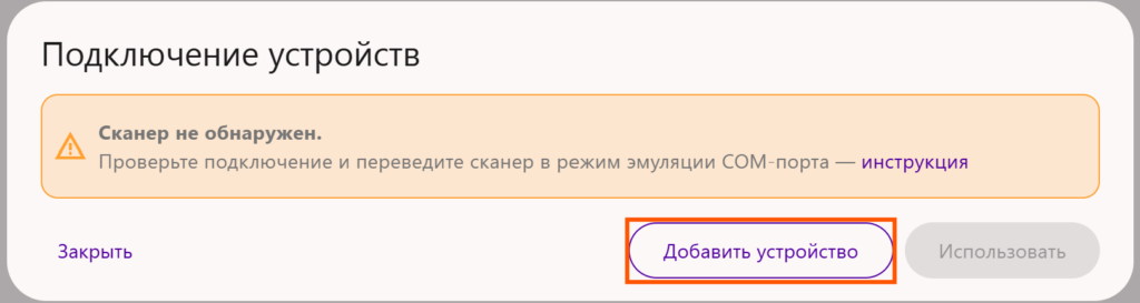 Если сканер ещё не подключен к сервису вы увидите окно: «Сканер не обнаружен. Проверьте подключение и переведите сканер в режим эмуляции COM-порта — инструкция»: