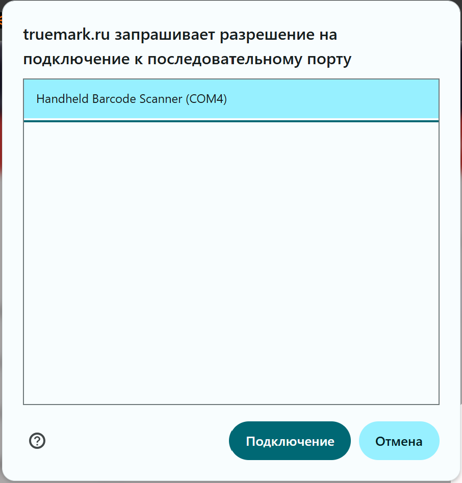 - Если сканер подключён и переведён в режим эмуляции COM-порта, он отобразится в списке. Выберите его и нажмите «Подключение»: