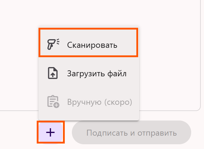 После создания УПД на этапе работы с товарами нажмите на «плюсик» и выберите «Сканировать»: